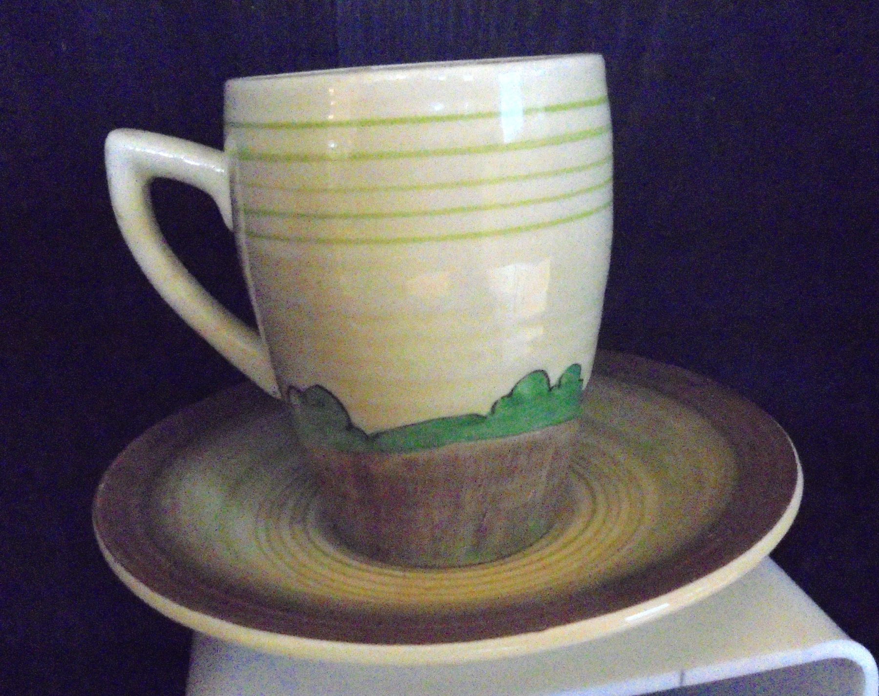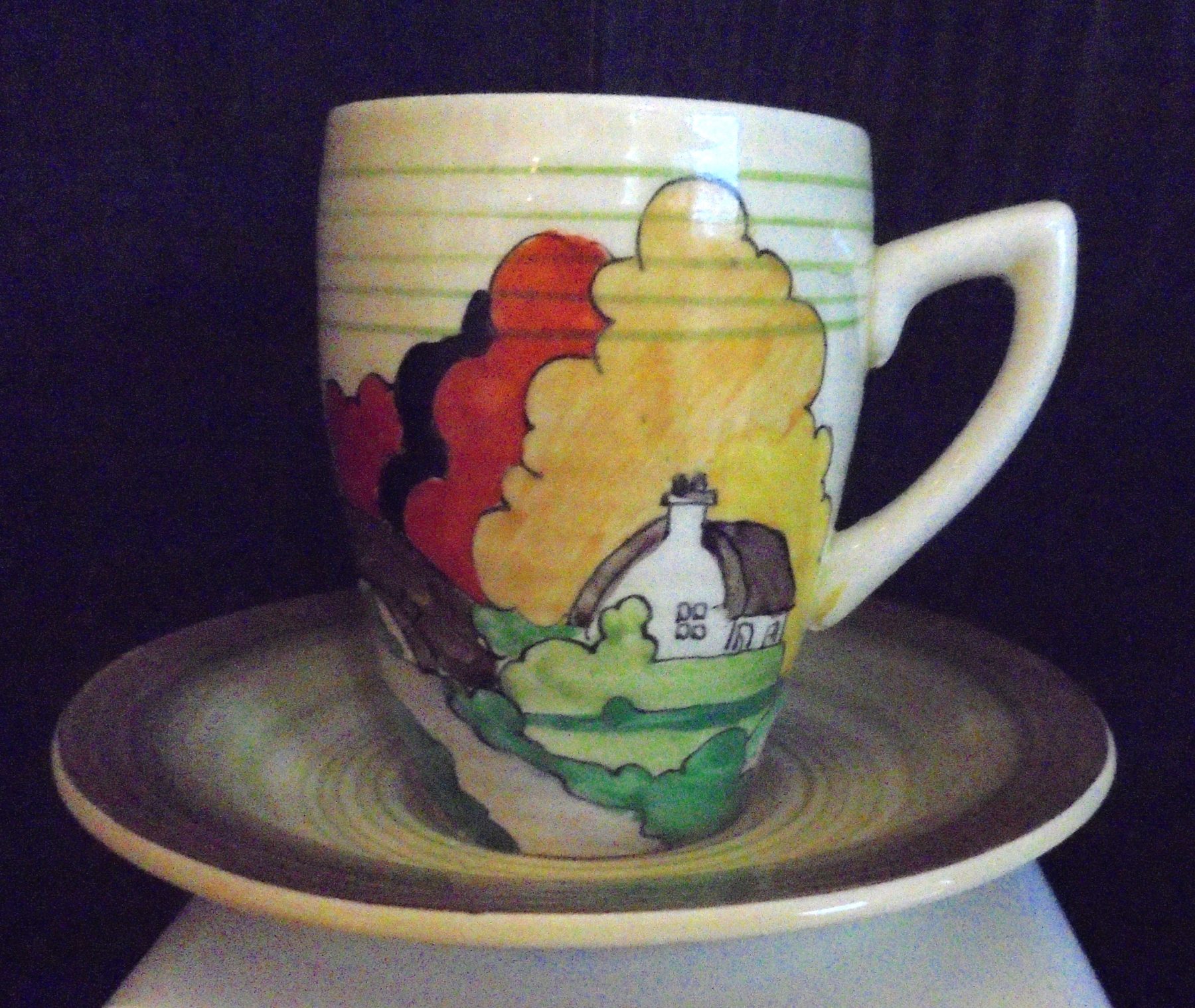 A fabulous little Lynton shape coffee can & saucer in LORNA pattern. This pattern was produced in 1936. It is in very good condition with no damage, chips, cracks or restoration.