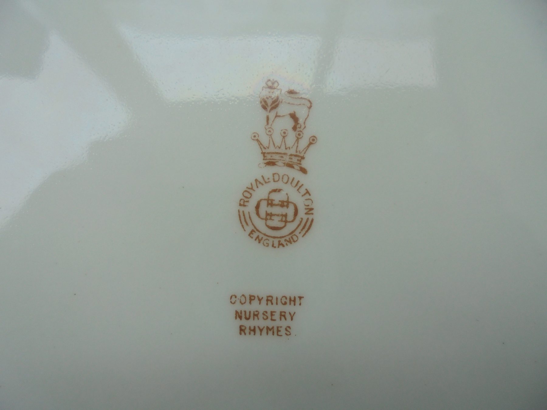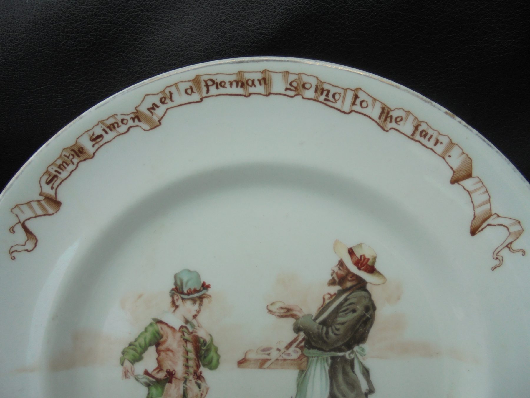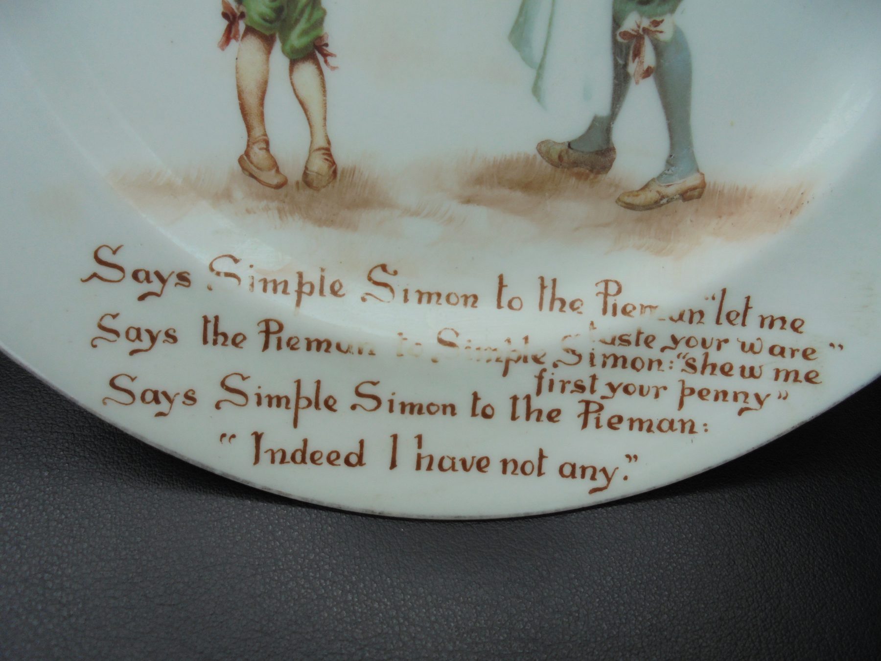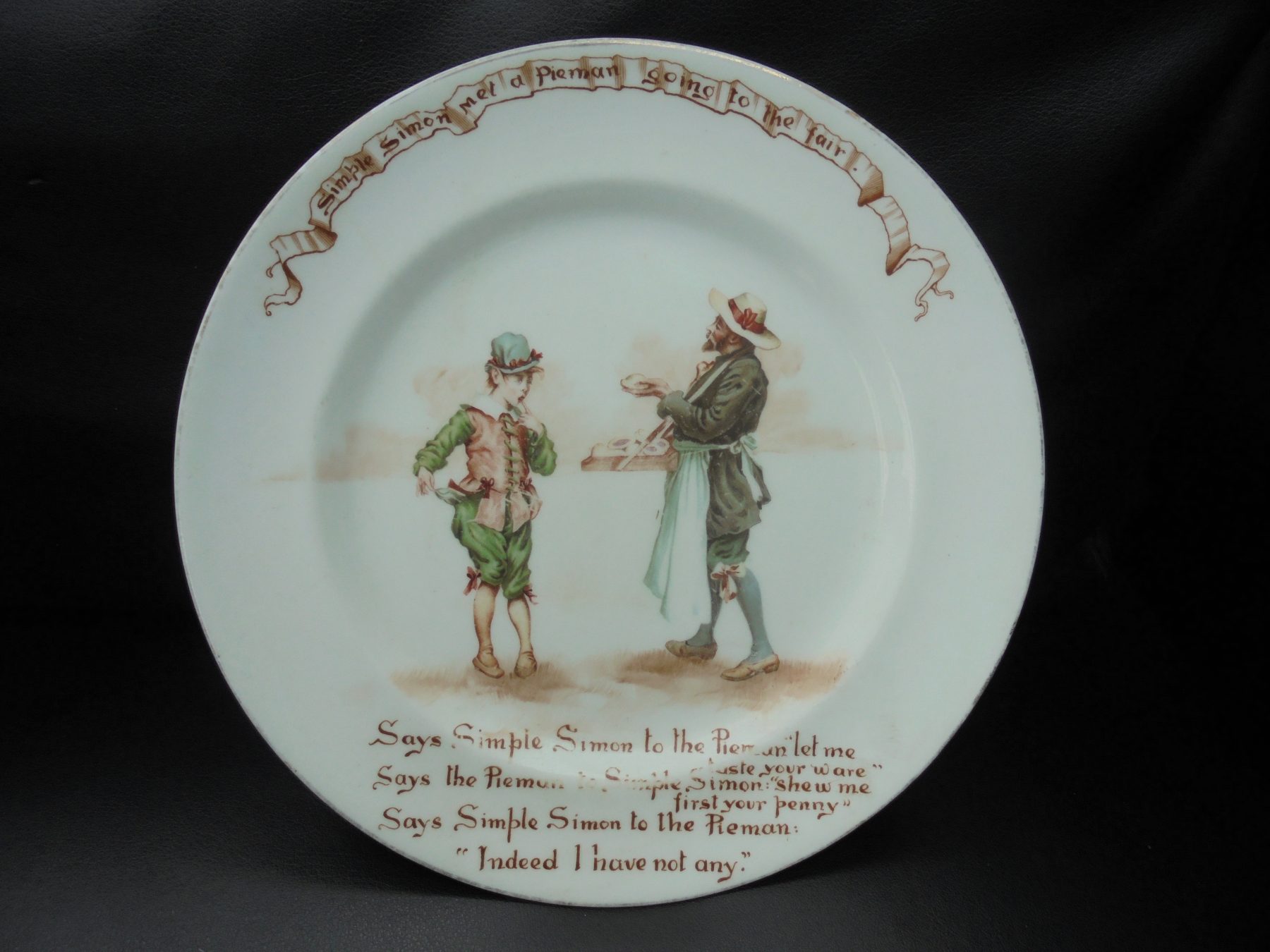 A super Royal Doulton Nursery Rhyme Series plate SIMPLE SIMON MET A PIEMAN GOING TO THE FAIR. This series designed by William Savage Cooper (1865 – 1943) and was first introduced in 1903 and withdrawn by 1939. The plate is 8 inches across and is in good condition with NO chips or cracks, just a little wear to the wording in the centre of the plate.