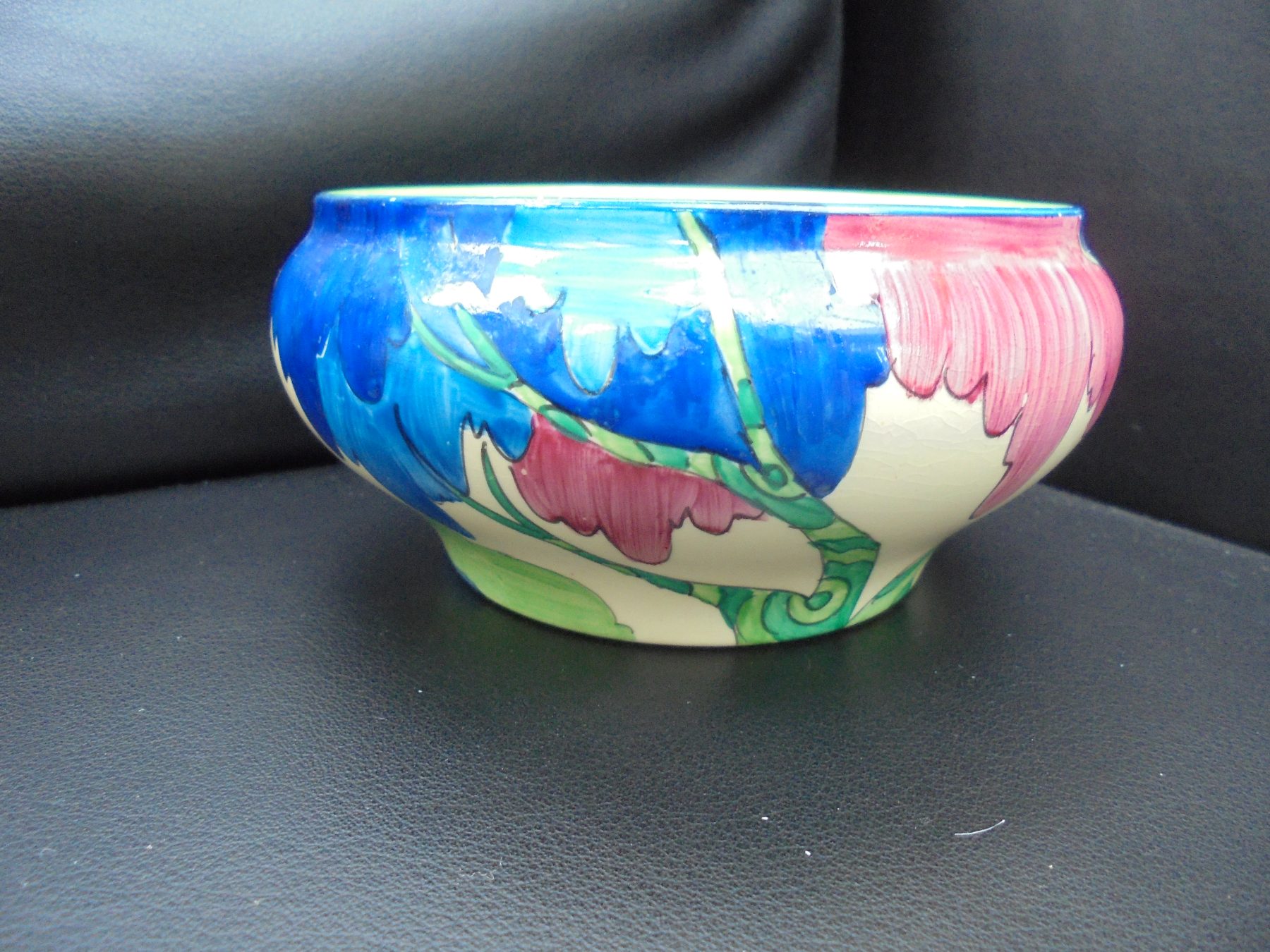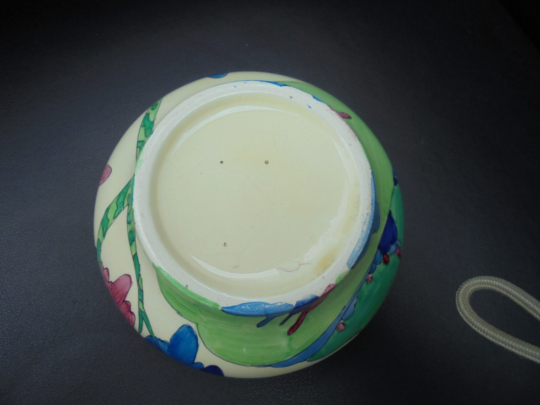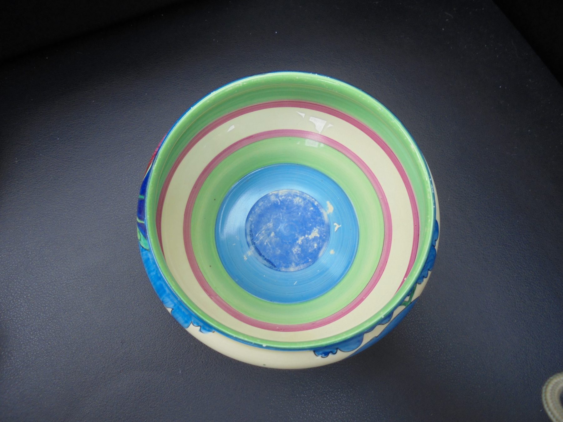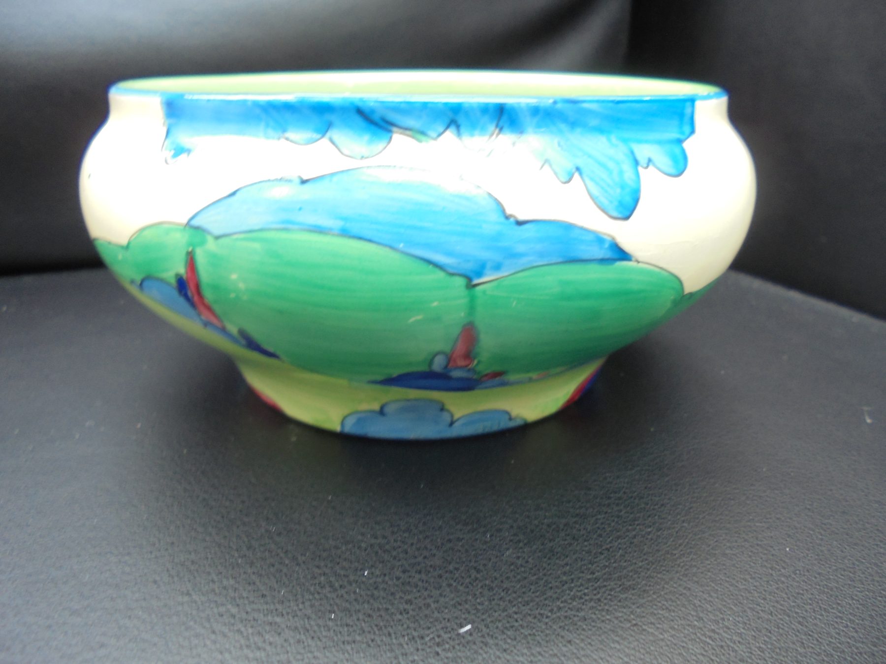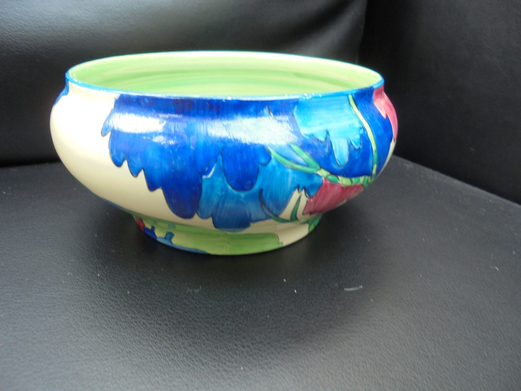 An amazing Ivor shape bowl in the very rare and sought after RUDYARD pattern. The bowl measures 2 1/2 inches high x 5 inches across and is in very good condition with NO damage, chips or cracks. Unfortunately the bowl does not have a Clarice Cliff  back stamp to the base and that is why it is priced very low. The pattern was produced between 1932 and 1934.